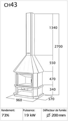 Descriptif technique :Puissance calorifique nominale : 19 kWRendement : 73 %Volume de chauffe maxi conseillé : 340 à 540 m3Energie : BoisMatière(s) : Acier double paroiFoyer : Briques réfractairesProvenance : EuropeGarantie : 10 ansDimensions hors tout H/L/P : 2700/960/570 mmOuverture de la porte H/L : 360/540 mmBûches : 75 cm maxiDiamètre de Raccordement : Sortie 200 mm verticalePoids : 150 KgFonctions et équipements :Tiroir à cendre : OuiFonction vitre propre : OuiFonction 24 heures non stop : Oui *Combustible briquette de lignite : OuiCombustible briquettes de bois : OuiSystème Feu continu : Oui **Régulation de la puissance : ManuelleFoyer : Briques réfractairesVentilateur(s) : NonNombre de cotés vitrés : 1Fonction poignée ...